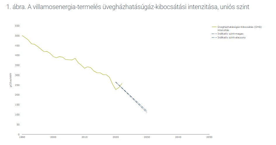 Ahhoz, hogy az EU nettó üvegházhatásúgáz-kibocsátása 2030-ig (az 1990-es szinthez képest) 55%-kal csökkenjen, és 2050-re megvalósuljon a karbonsemlegesség, a villamosenergia-termelésnek dekarbonizációját Unió-szerte gyorsítani kell. Az 1. ábra olyan indikatív intenzitási szinteket mutat be, amelyek összhangban lennének az EU éghajlat-politikai célkitűzéseivel.