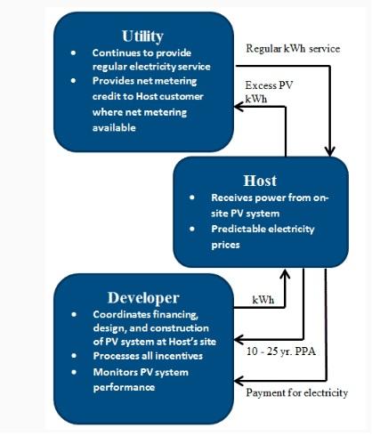 A napenergia adásvételi szerződés (PPA) egy olyan pénzügyi megállapodás, amelyben a fejlesztő gondoskodik egy napenergia-rendszer tervezéséről, engedélyezéséről, finanszírozásáról és telepítéséről az ügyfél ingatlanán, csekély vagy költségmentesen. A fejlesztő a megtermelt áramot fix áron értékesíti a fogadó ügyfélnek, amely általában alacsonyabb, mint a helyi közszolgáltató kiskereskedelmi díja. Ez az alacsonyabb villamosenergia-ár arra szolgál, hogy ellensúlyozza a fogyasztó által a hálózatból vásárolt villamos energiát, miközben a fejlesztő megkapja az ilyen villamosenergia-értékesítésből származó bevételt, valamint a rendszerből származó adójóváírásokat és egyéb ösztönzőket. A HTM-ek jellemzően 10 és 25 év közöttiek, és a fejlesztő továbbra is felelős a rendszer üzemeltetéséért és karbantartásáért a megállapodás időtartama alatt. A HTM-szerződés lejártakor az ügyfél meghosszabbíthatja a HTM-et,