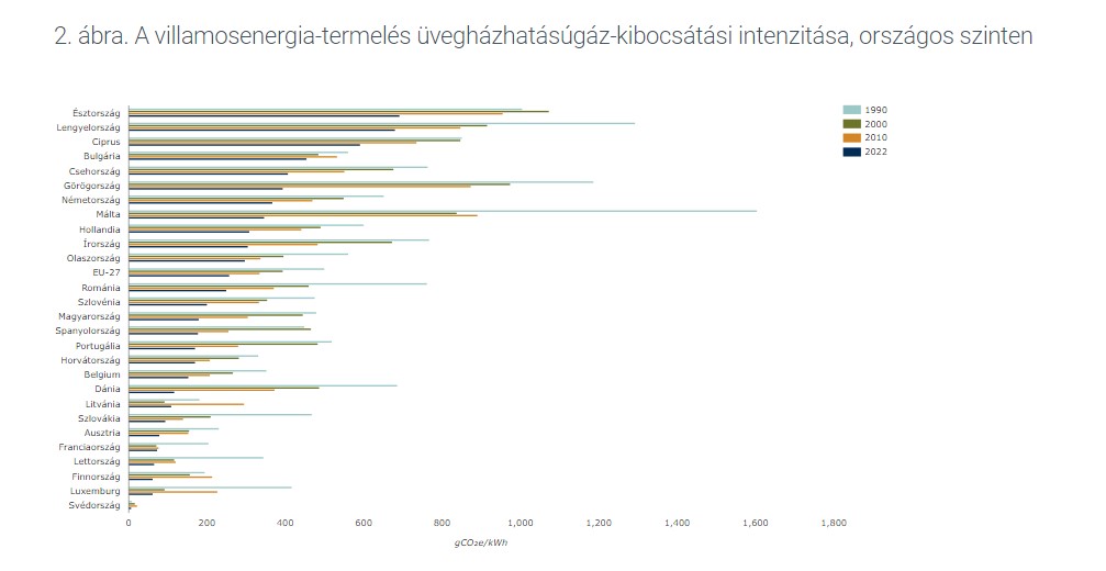 Ami a nemzeti eredményeket illeti, az 1990–2022 közötti időszakban a villamosenergia-termelés dekarbonizációjának aránya Luxemburgban (85%-os csökkenés), Dániában (83%), Lettországban (81%), Szlovákiában (80%) és Máltán (78%) volt a legmagasabb. Az EU-n kívüli EGT-országokban az Izlandon termelt és a Norvégiában előállított villamos energia nagy része megújuló forrásokból származik, ezért ÜHG-kibocsátási intenzitásuk nagyon alacsony. Törökországban viszonylag magas az ÜHG-kibocsátás intenzitása a villamosenergia-termelésben.