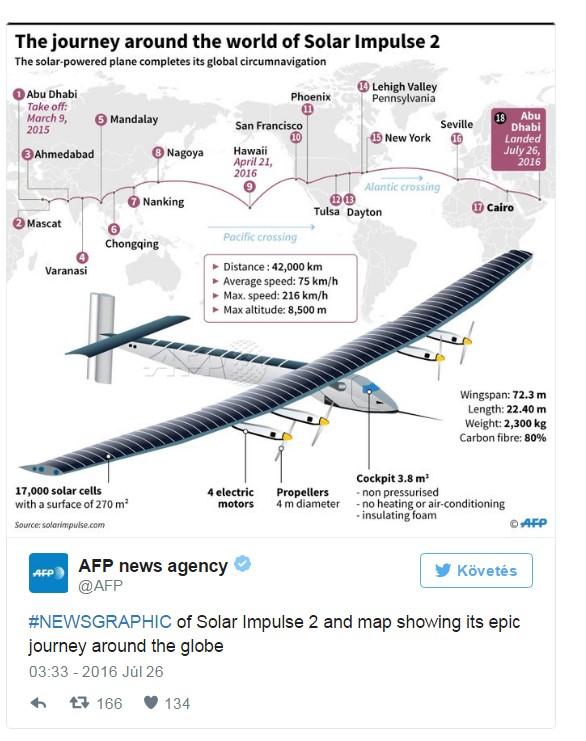Az AFP hírügynökség alábbi térképén jól látható, hogy a tavaly márciusban indult földkörüli útnak 16 további állomása volt. A leghosszabb szakasz a Csendes-óceán felett volt, Japán és Hawaii között. Ezt a 7212 kilométeres távot 118 óra alatt teljesítette a repülő.
