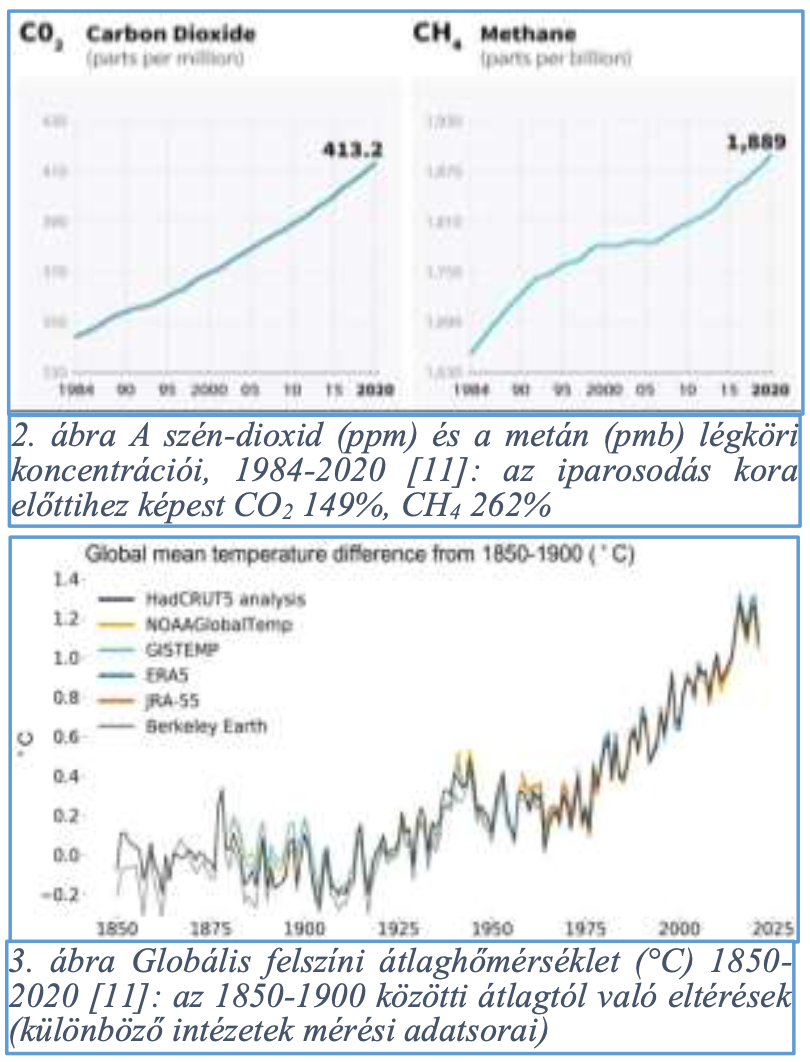 - A Meteorológiai Világszervezet közleménye szerint 2020- ban az iparosodás előtti szintnél a légkörben a szén- dioxid koncentrációja 49%-kal, a metáné 162%-kal volt magasabb (2. ábra) és e trendekre alig hatott a jelenlegi pandémia miatti átmeneti kibocsátáscsökkenés [11]. Az 1992. évi egyezmény célkitűzésével szemben tehát az érintett gázok szén-dioxid egyenértékben (ti. a szén-dioxid „globális melegítő potenciáljának” egyenértékében) számított légköri mennyisége azóta is folyamatosan növe- kedett. A globális felszíni átlaghőmérséklet pedig az 1970- es évek óta – továbbra is jelentős és különböző okokkal magyarázott változékonyság mellett [12] – majdhogynem töretlenül emelkedik (3. ábra).