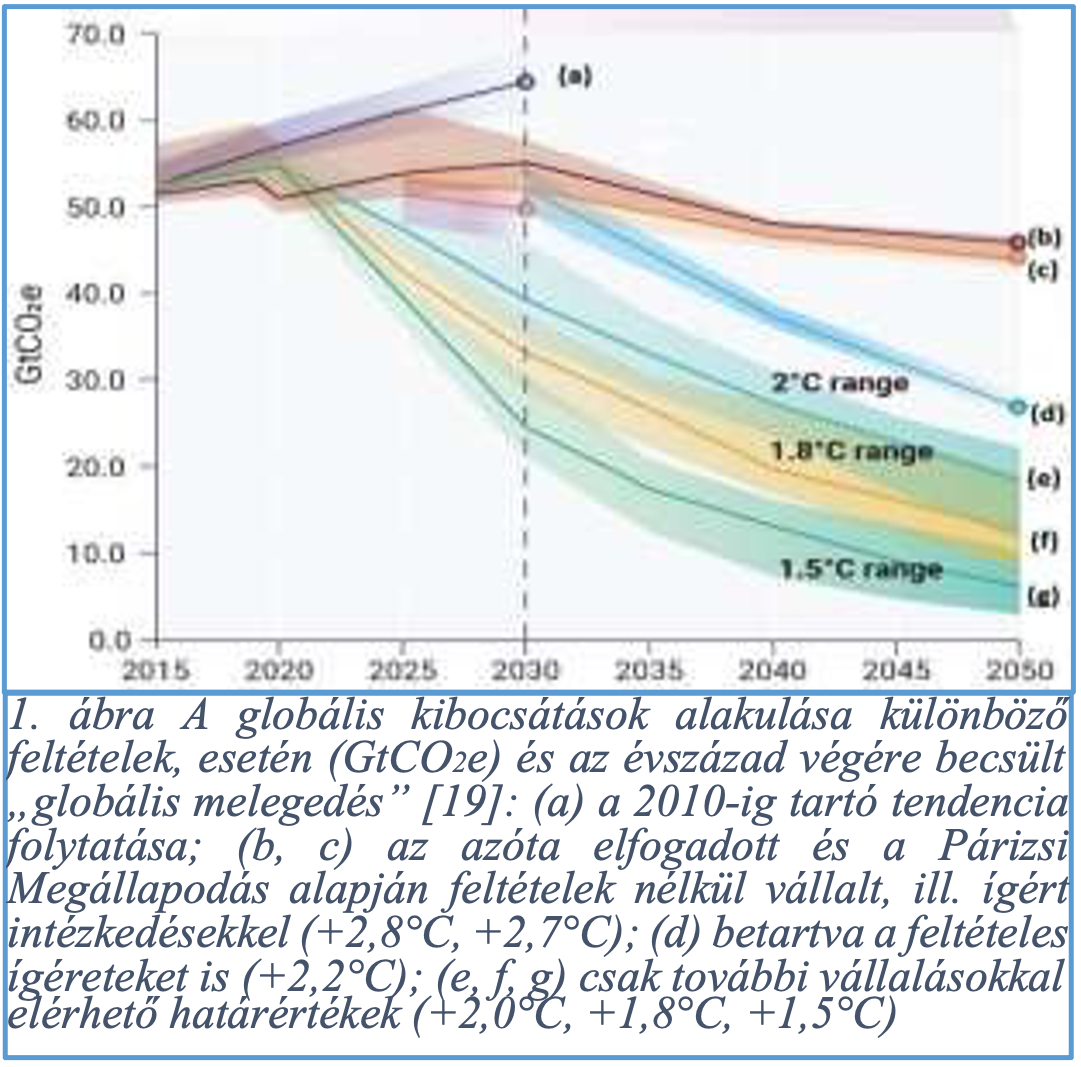 A 2015. évi Párizsi Megállapodás is a keretegyezmény hatálya alá tartozik, de sokkal konkrétabbá tette annak célkitűzését azáltal, hogy megszabta a globális átlagban vett felszíni hőmérsékletemelkedés elkerülendő határértékeit és ehhez igazítva megadott egy ütemtervet a globális kibocsátáscsökkentésre [5], [6]. E kibocsátások sorában továbbra is a legnagyobb gondot a fosszilis tüzelőanyagok felhasználásából eredő szén- dioxid emisszió jelentette.