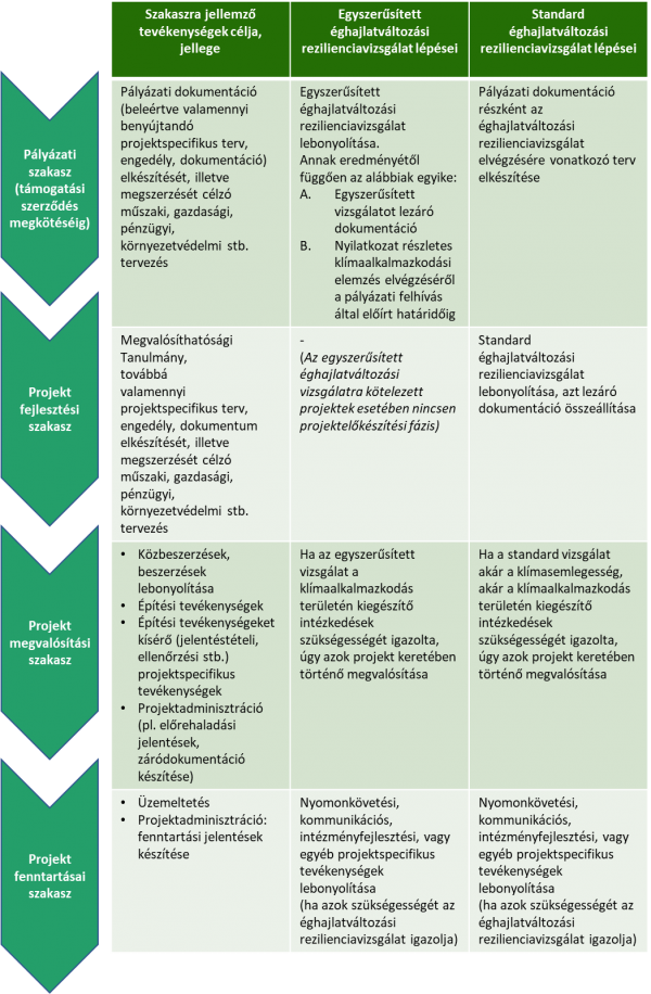 A fenti szempontok következtében az éghajlatváltozási rezilienciavizsgálat projektmenedzsment ciklusban elfoglalt helyére vonatkozóan csak nagyon általános érvényű megállapítások tehetők. Éppen ezért az alábbiakban csak a projektek lebonyolításának legalapvetőbb szakaszait különítjük el, és azokhoz rendelve mutatjuk be, hogy az éghajlatváltozási rezilienciavizsgálathoz kapcsolódóan melyik fázisban milyen feladatok jelentkeznek a támogatást igénylő, illetve kedvezményezett számára.